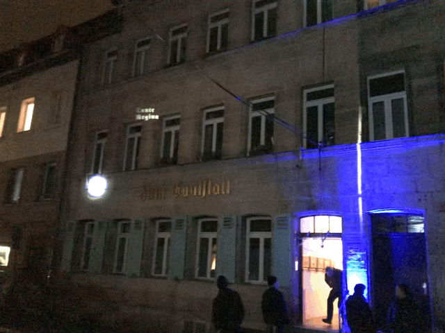 Ein 35mm Kinoprojektor projiziert von der gegenüberliegenden Straßenseite auf die Fassade des Wohnhauses Jakob Wassermanns.