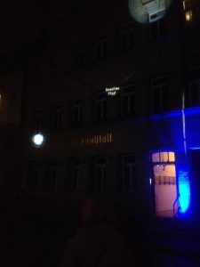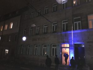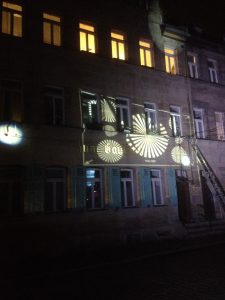 Ein 35mm Kinoprojektor projiziert von der gegenüberliegenden Straßenseite auf die Fassade des Wohnhauses Jakob Wassermanns.
