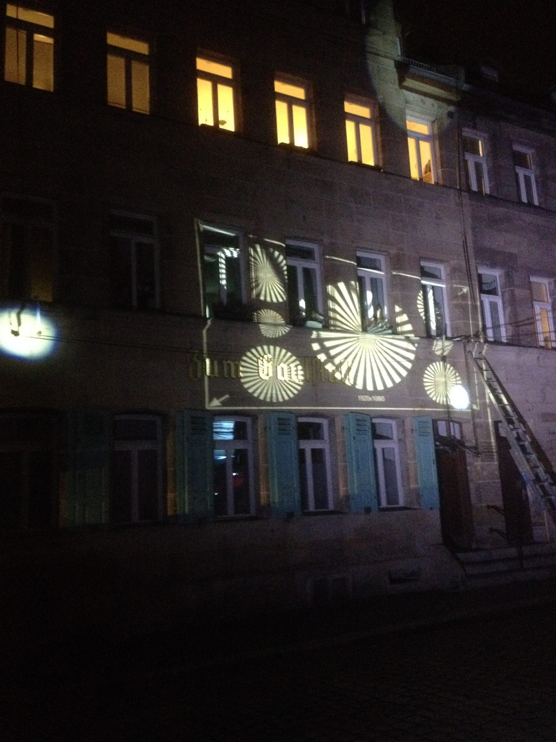 In die Projektion sind Filmbilder mit den Namen von Personen aus Wassermanns Romanen und Erzählungen eingeklebt. Sie blitzen kurz in weiß auf der Sandsteinfassade und den Fenstern auf.